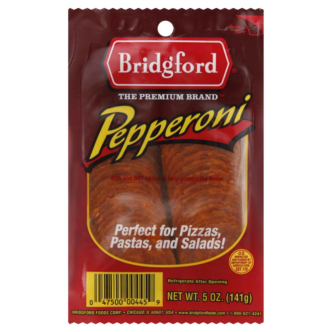 Contactless delivery and your first delivery or pickup order is free. Bridgford Gluten-Free Pepperoni 5 Oz. Net wt 5 oz 141g.
